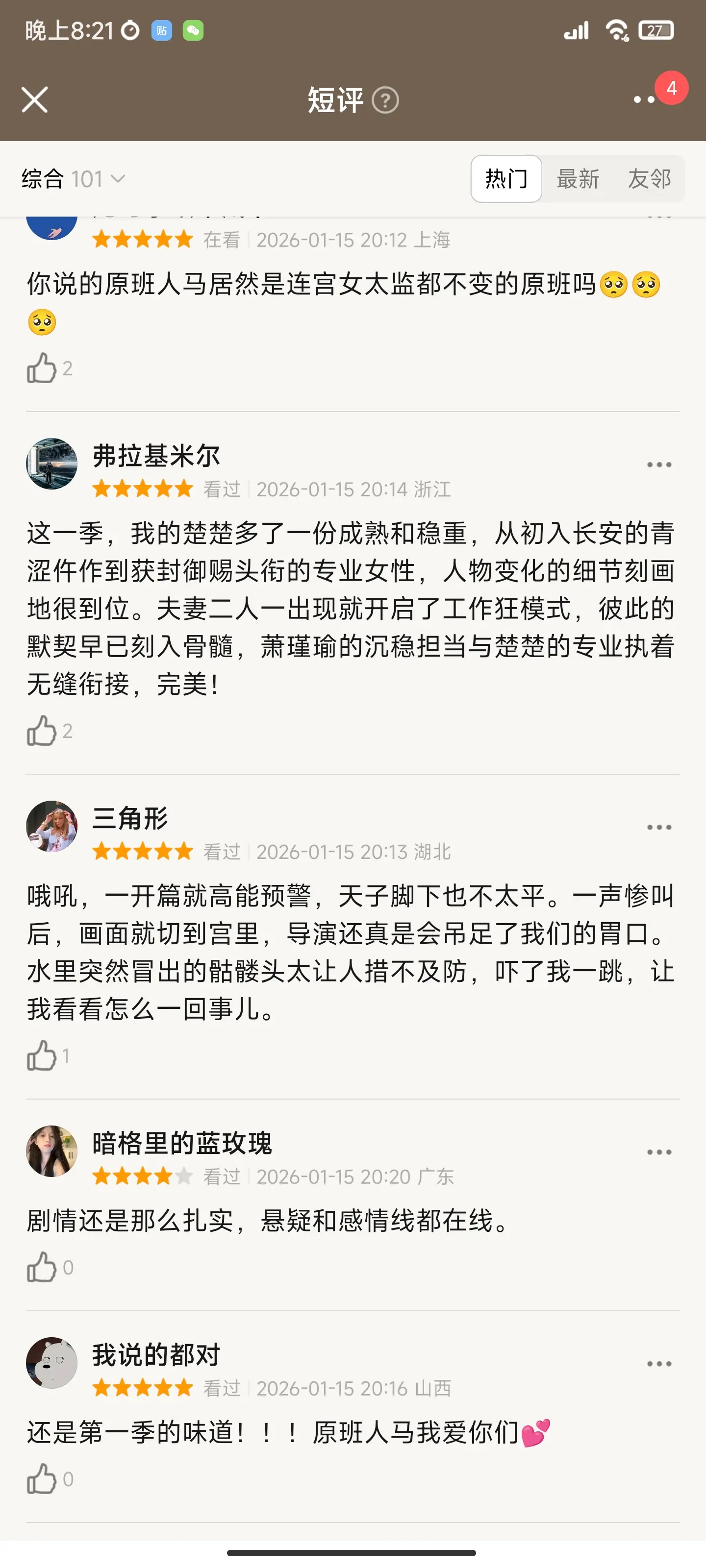 而且原班人马,就连宫女太监都没换,是真的很尊重观众了。三法司的默契还是老样子,没有陌生感。夫妻二人一出现就开启工作狂模式,彼此默契,萧瑾瑜的沉稳担当和楚楚的专业执着无缝衔接,完美。